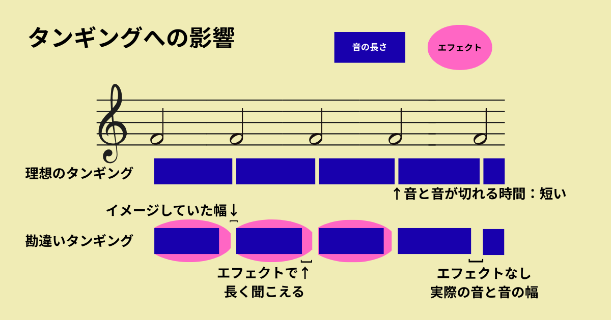 エフェクトの効果で遷延した音を聴いてタンギングしていたことになります。