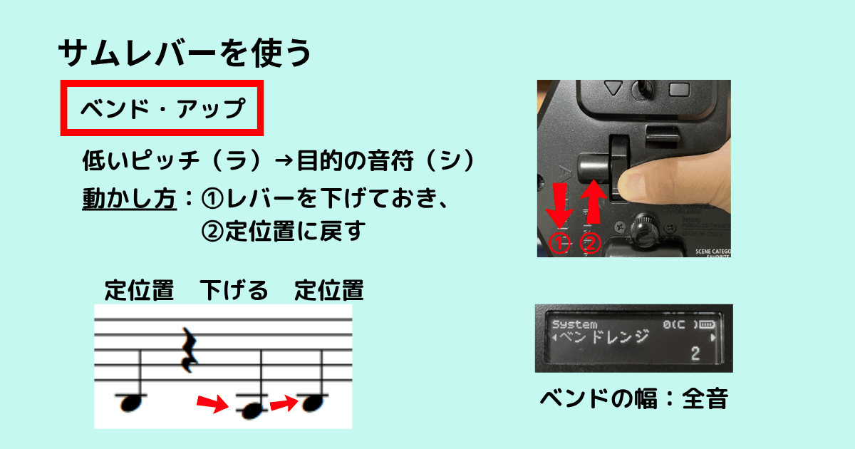 個人的に操作しやすいのは、サムレバーでベンドして、「低いラ」を出す方法でした。