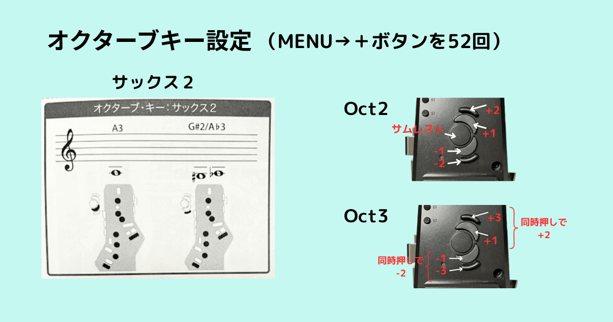 - オクターブ3:上下3オクターブの切り替えが標準運指で可能