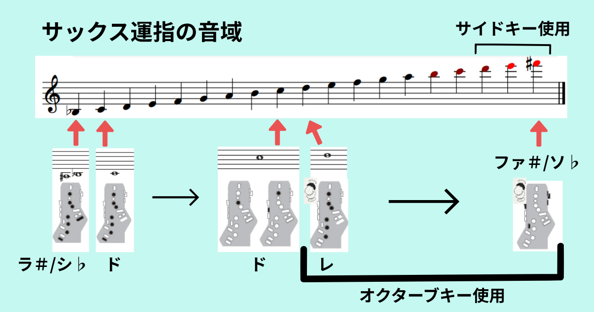 サックス運指とほぼ同じですが、ミ♭など若干運指が違うところがあるので、注意が必要です。