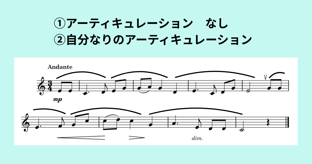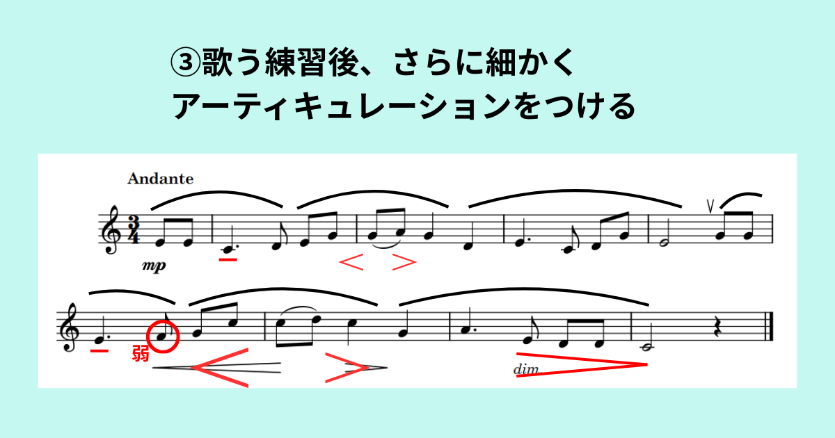 ②自分なりにアーティキュレーション(強弱、スラーなど)をつけて20分ほど練習
